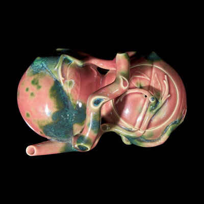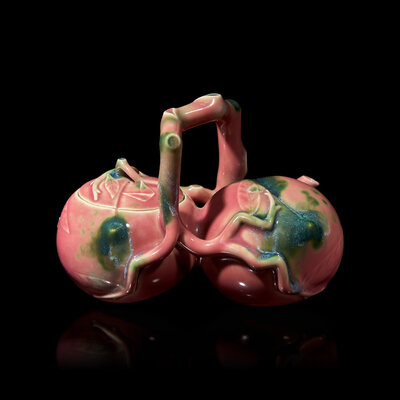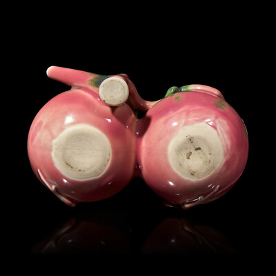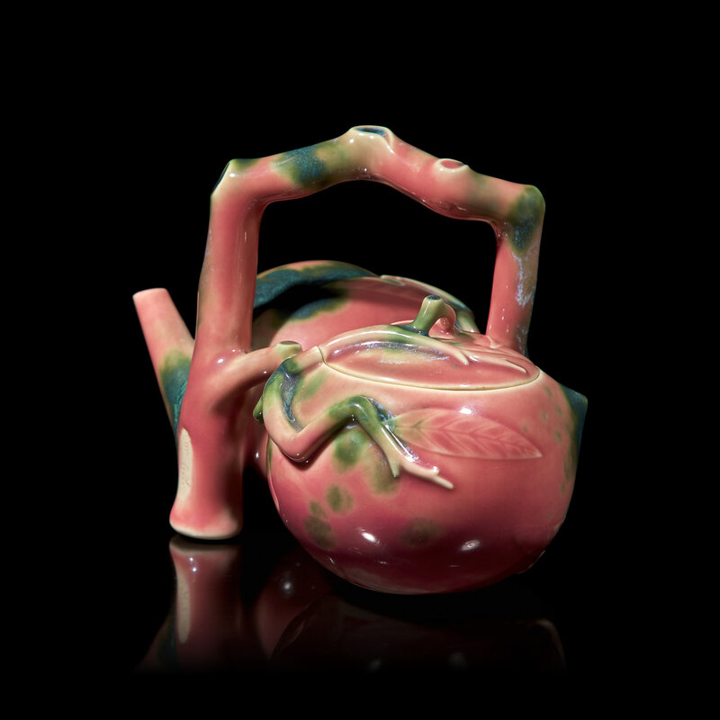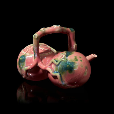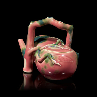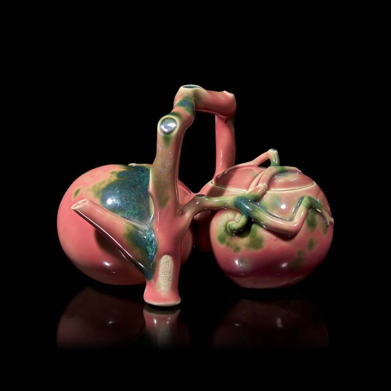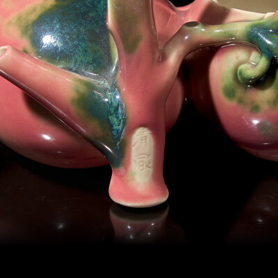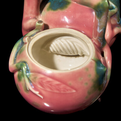 Modeled in the form of two peaches, the cover to one, the spout coming from a branch to the side of the other, glazed pink with with splashes of green toning to opalescent blue, the side of the branch incised Seifu.