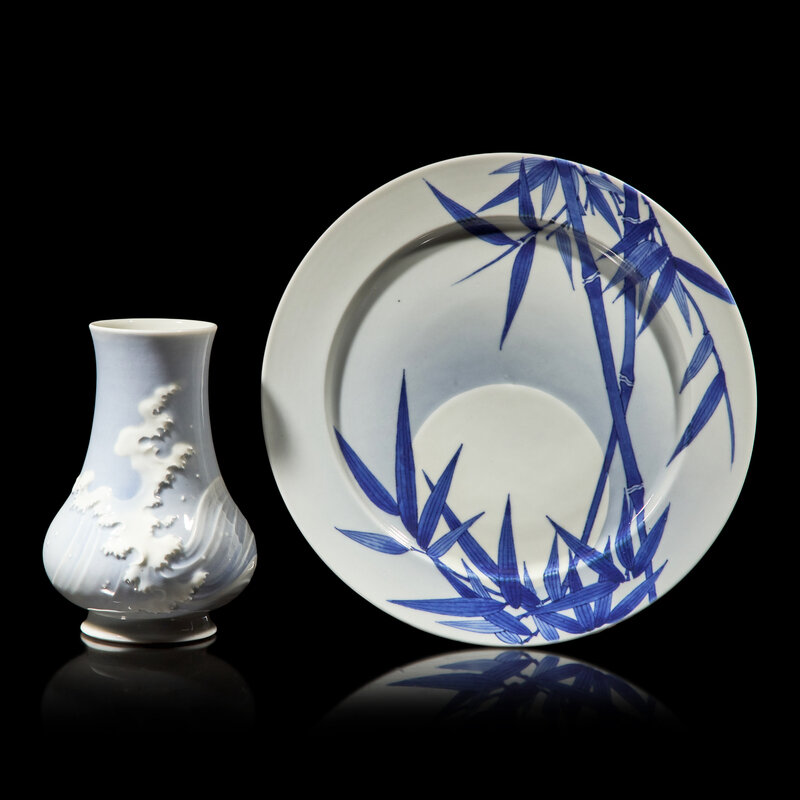 A Japanese Porcelain "Waves" Vase, Shofu Katei, and a "Moon in Bamboo" Dish, Seifu Yohei III
