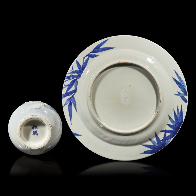 The slightly bellied vase elegantly modeled with crashing waves, underside with artist's signature in underglaze blue; the circular dish painted in underglaze blue with a full moon in low relief seen through bamboo leaves, additional "over the wall" leaves to underside, incised Seifu.
