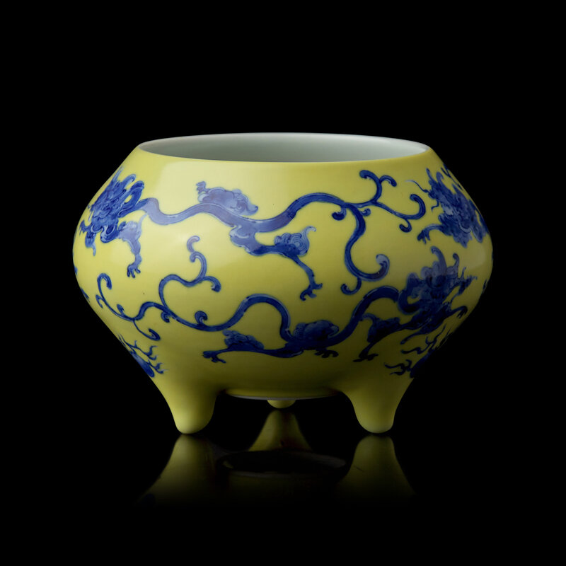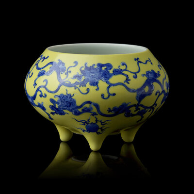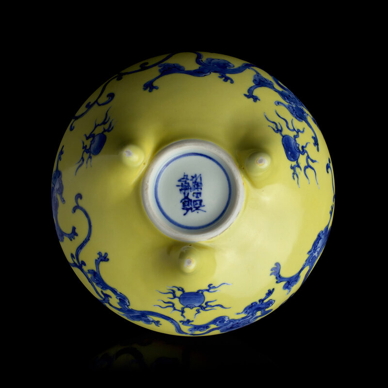 Of globular form on three tapered feet, decorated with archaic stylized dragons and flaming "jewels" in underglaze blue against a yellow enamel ground, underside with mark in underglaze blue within a circle.