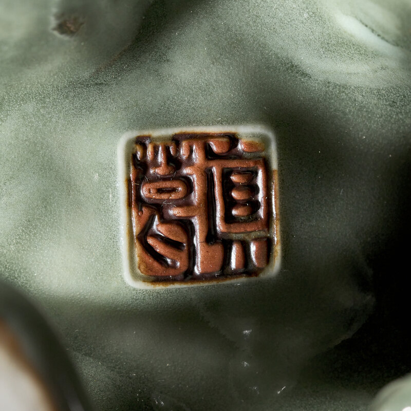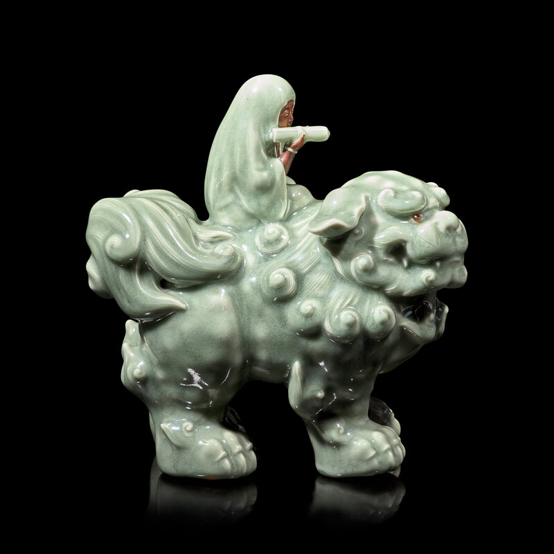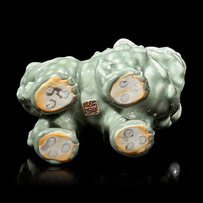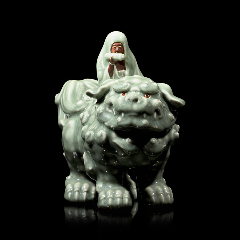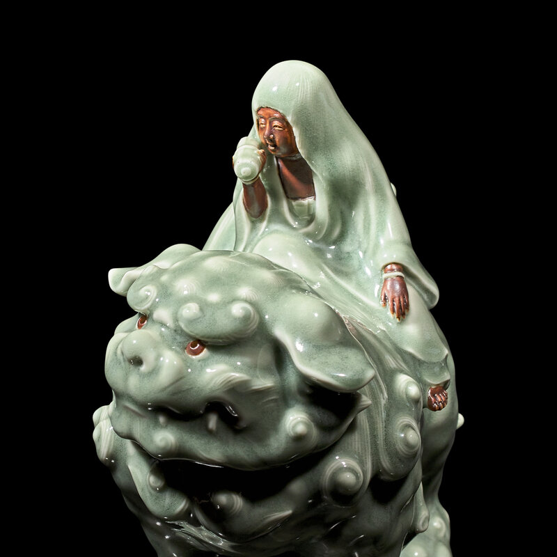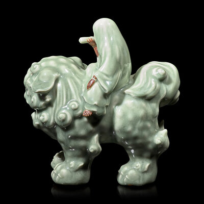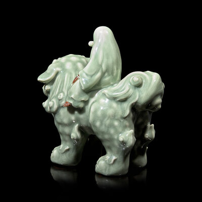 A Japanese Celadon-Glazed Monju on Lion, Impressed Seal Makuzu