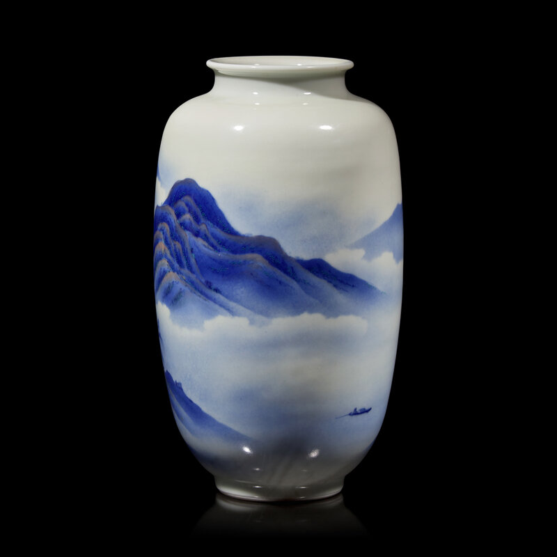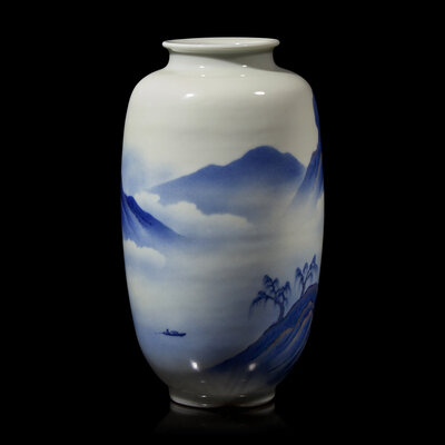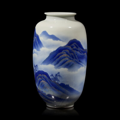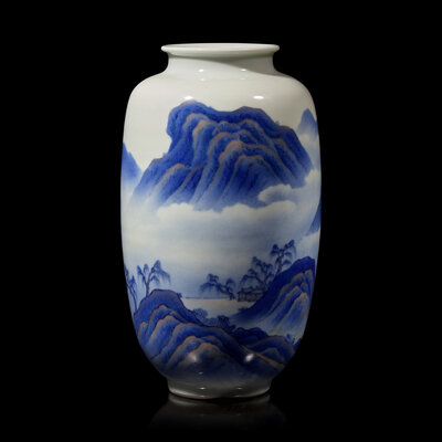 A Japanese enameled Blue and White Ovoid 'Landscape' Vase, Signed Makuzu Kozan Saku