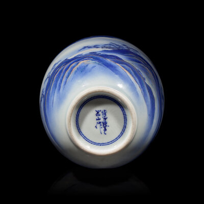 Possibly by Tomonosuke (Kakuzu Kozan IV), decorated with a fisherman and pavilions in an extensive misty landscape, the mountains highlighted with pale green and rose-toned enamels; mark to underside in underglaze blue.