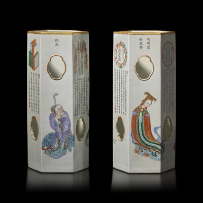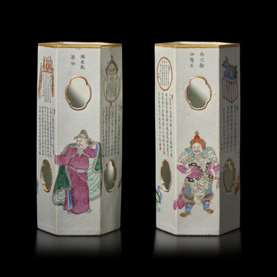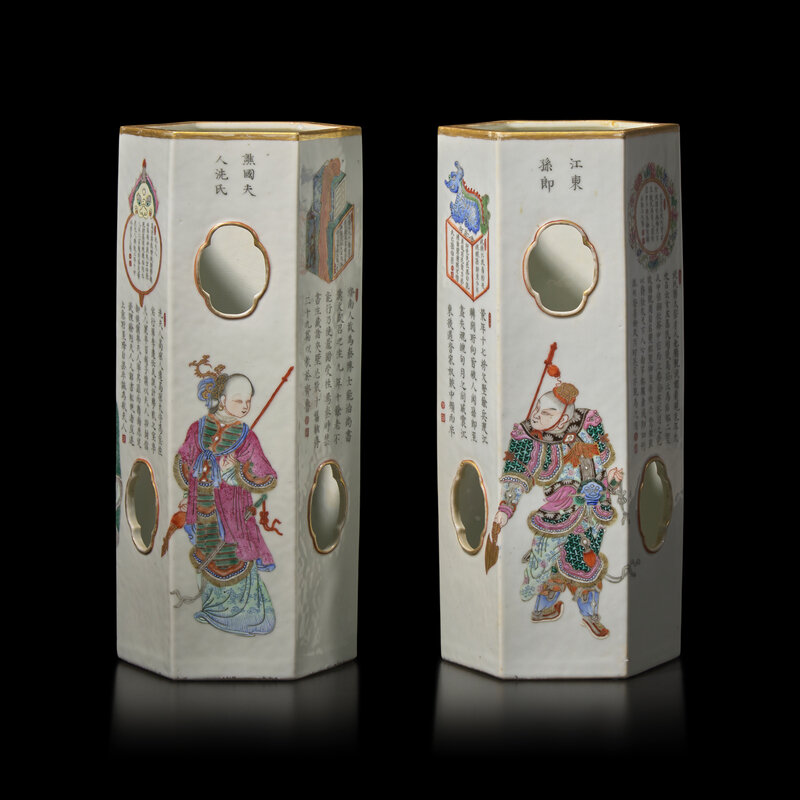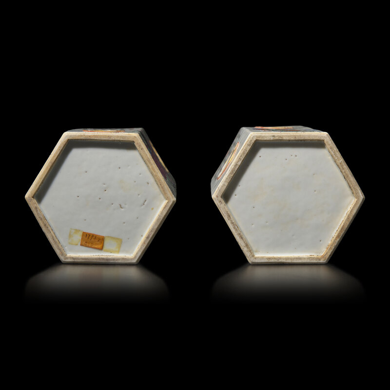 A Pair of Chinese Famille Rose Hexagonal 'Wushuangpu' Hat Stands, Qing Dynasty, 19th Century