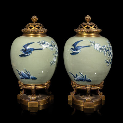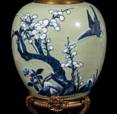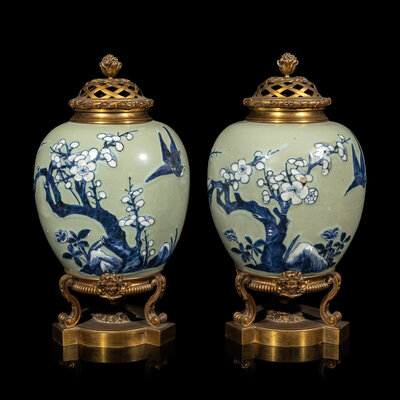 A Pair of Chinese Celadon Ground Blue and White Porcelain Jars with Later Ormolu Mounts, Porcelain: Kangxi Period, Mounts: Late 19th/Early 20th Century