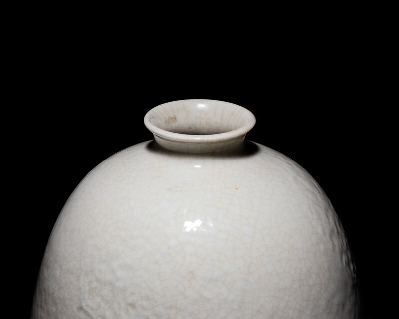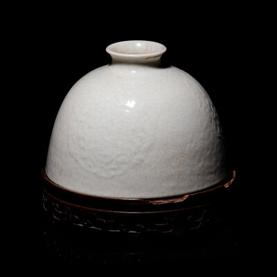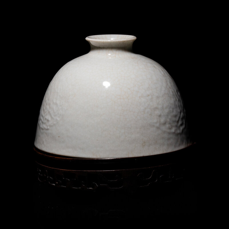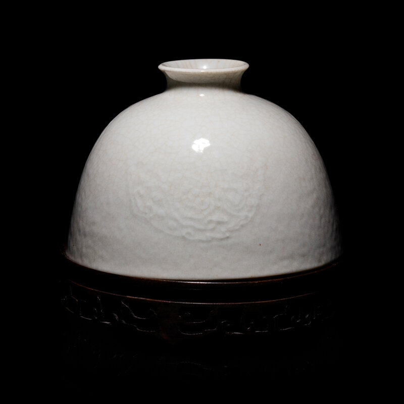 The rounded sides rise to a short, slightly flaring neck, and incised with three archaistic dragon roundels beneath a white glaze suffused with a network of small crackles, raised on a fitted hardwood stand.