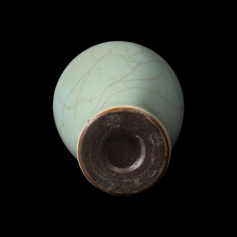 The elegantly potted vase has broad shoulders below a short, waisted neck, tapering towards the slightly flared foot, covered overall in a lustrous pale blue glaze with russet crackle, the underside covered in brown.