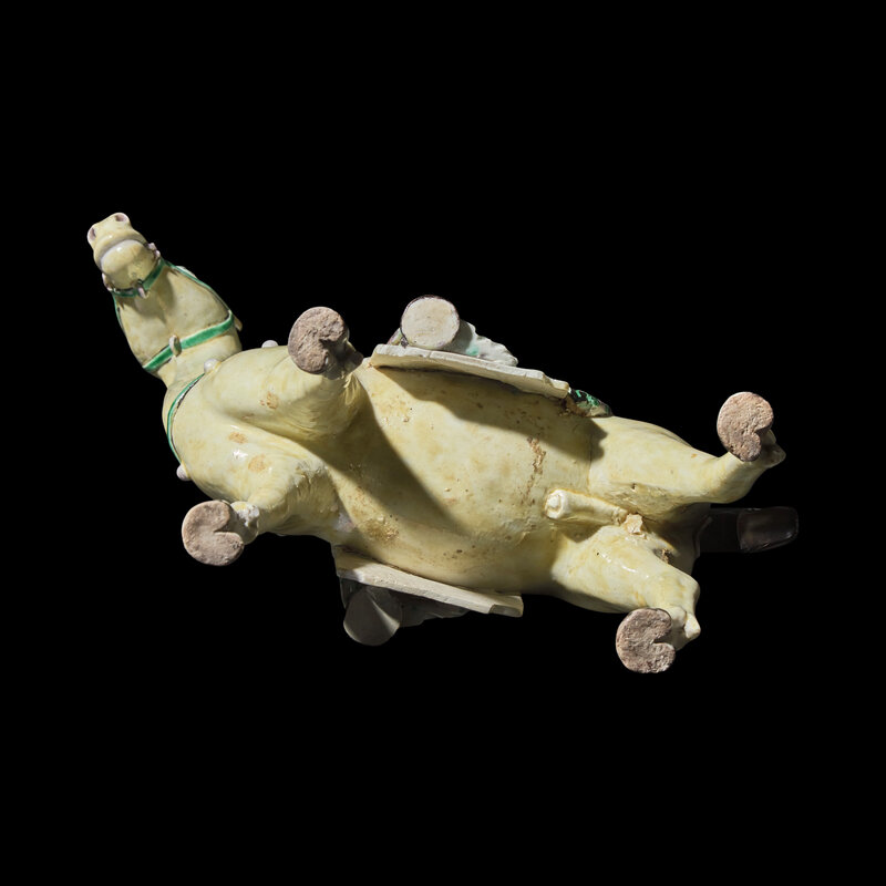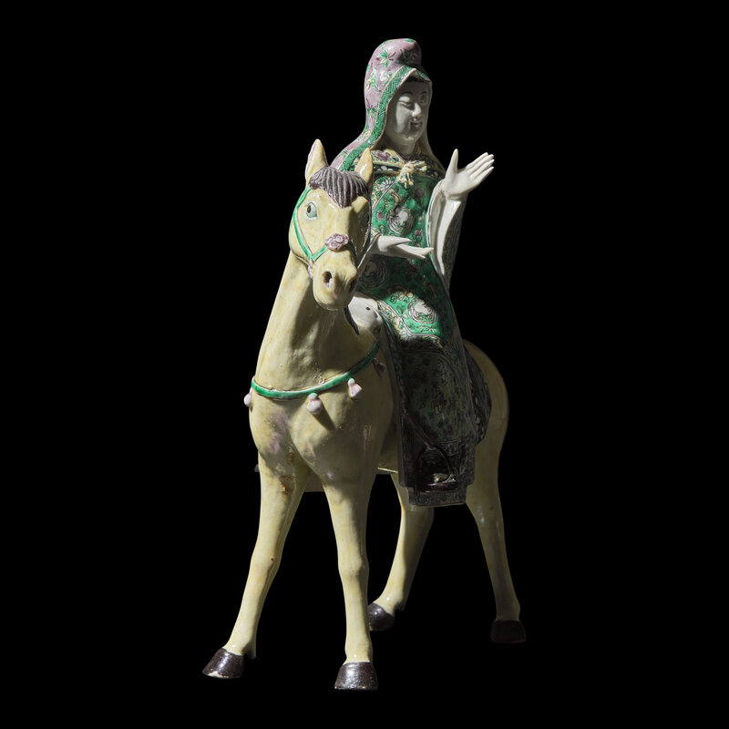 The ceramic sculpture depicts a noble lady draped in an opulent robe of deep green and aubergine, seated gracefully atop a stallion The horse itself is glazed in yellow and adorned with decorative details.