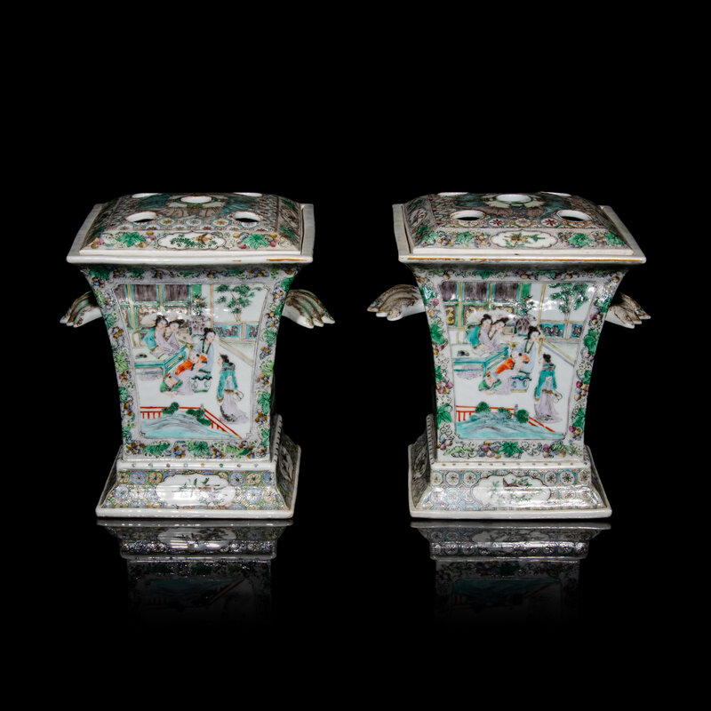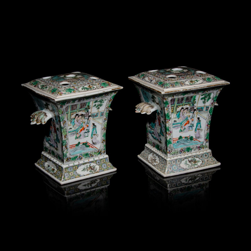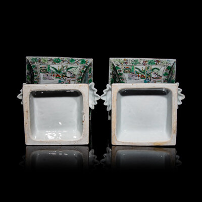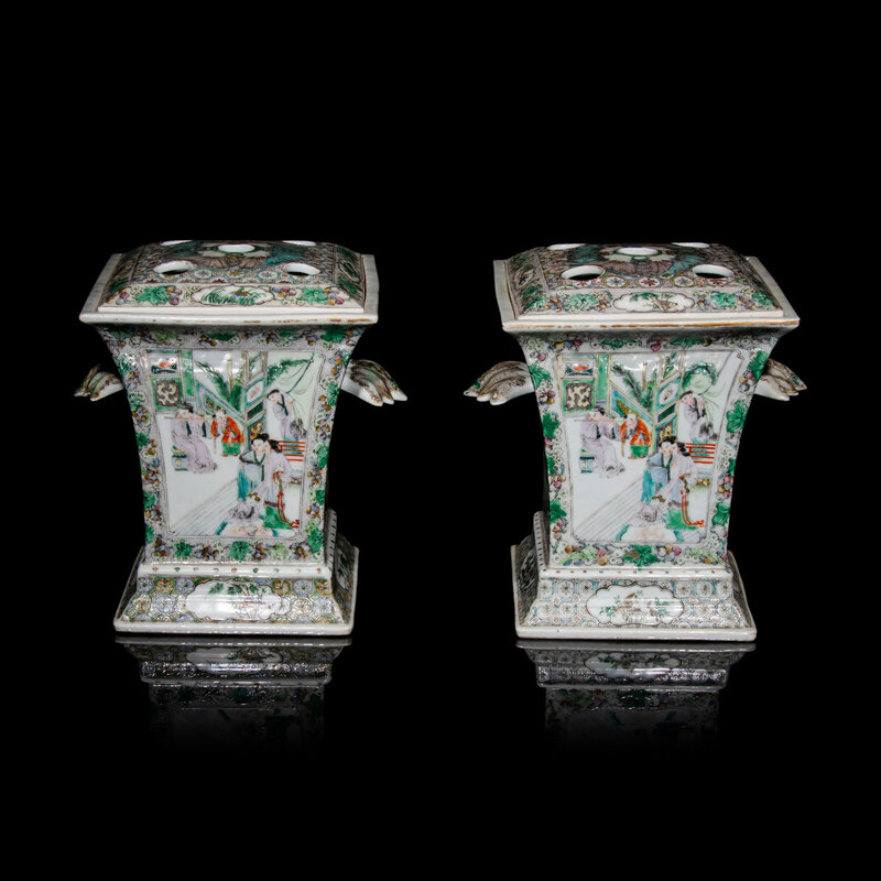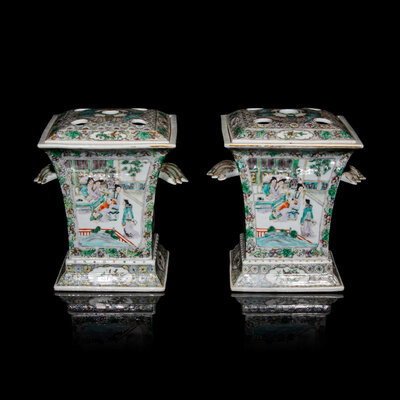 This unusual pair of bough pots is richly decorated, with each vessel flanked by a pair of Yinglong—powerful winged dragons from Chinese mythology. All four sides are adorned with detailed scenes of court ladies engaged in elegant pursuits, set against a delicately incised sgraffito ground, suggesting an evolution from designs originating in the early 18th century. These figural panels are separated by borders of lush flora and foliate motifs, which wrap around the upper section of each pot. The pieces are crowned by finely detailed covers, each pierced with five carefully placed drill holes.
