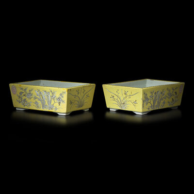 民國 黃地墨彩花卉紋長方水仙盆一對