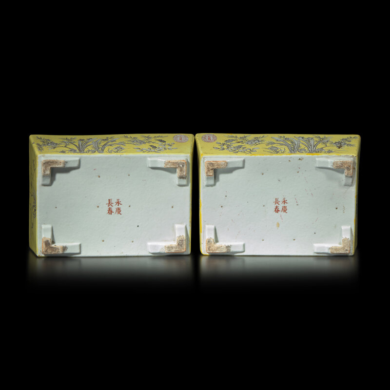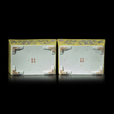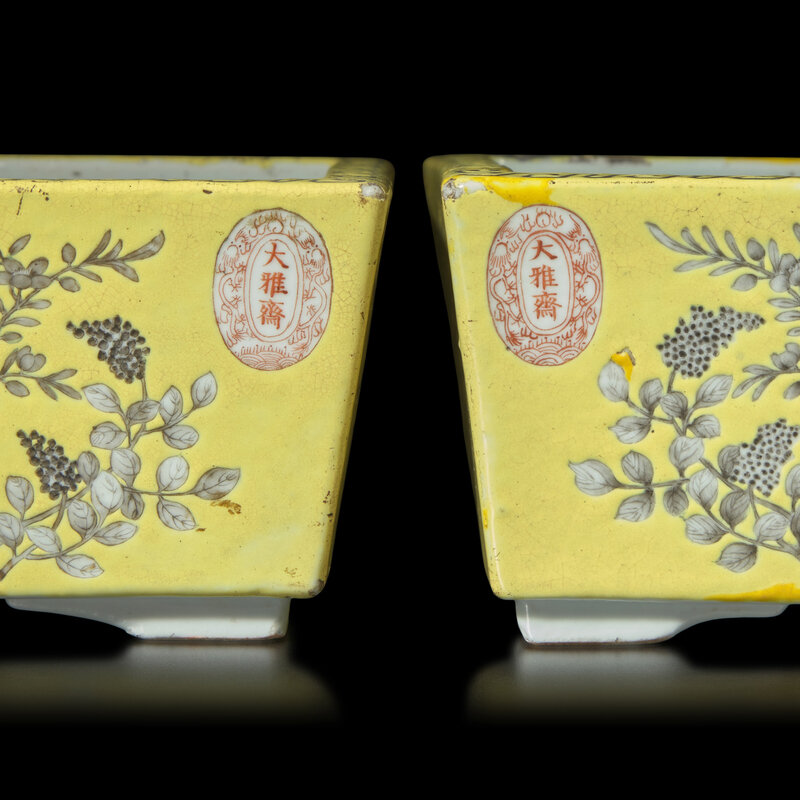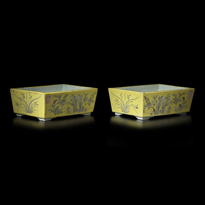 A Pair of Chinese Dayazhai-Type Grisaille Decorated Yellow Ground Porcelain Rectangular Jardinières, Republic Period