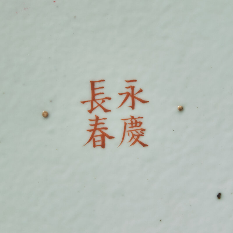 The exterior walls painted with a variety of flowering plants, each planter with a three-character Dayazhai mark within oval cartouches, the base with a four-character Yongqing changchun iron red mark.