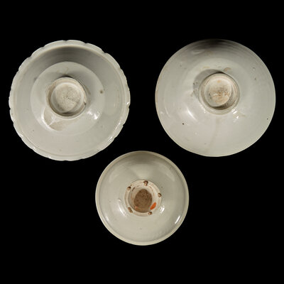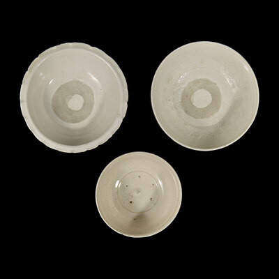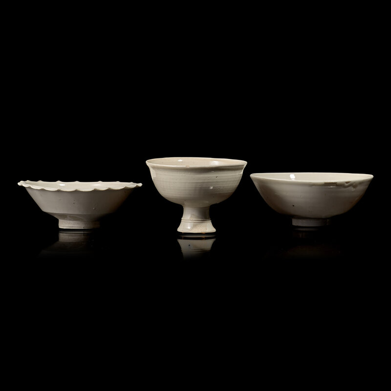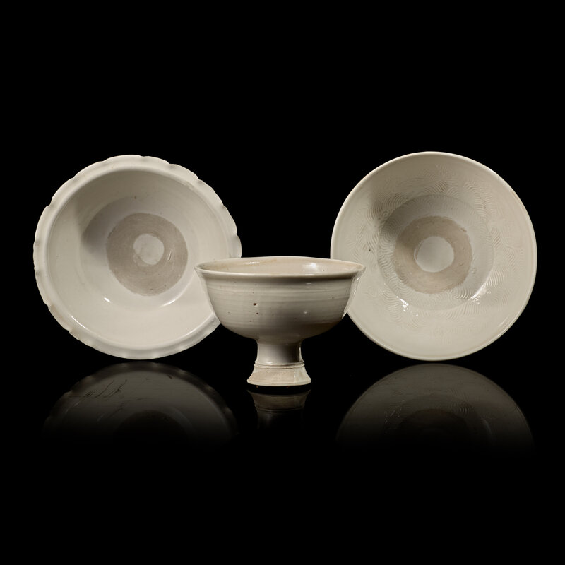 Two Chinese Huozhou White Glazed Bowls and a Stem Cup, Song Dynasty
