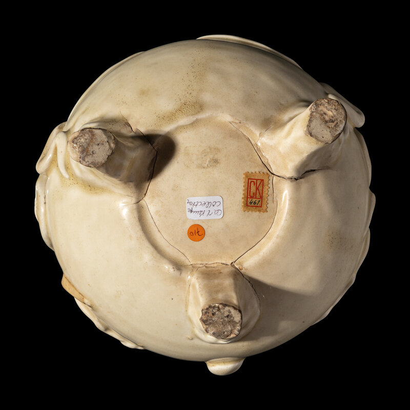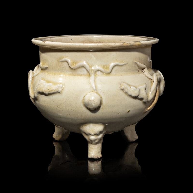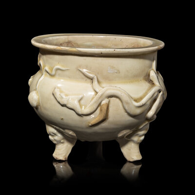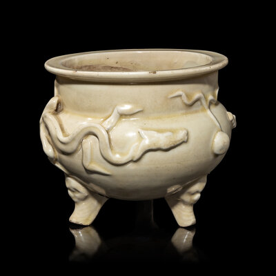 The compressed globular body with short waisted neck and broad everted rim all supported on three splayed legs issuing from monster masks, applied around the exterior with a pair of freely modeled sinuous dragons in mutual pursuit of a flaming pearl, covered overall with a creamy-white slip and opaque glaze.
