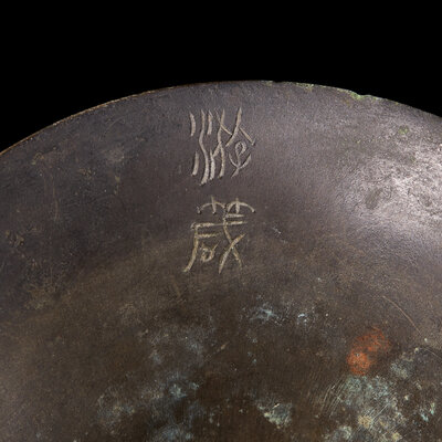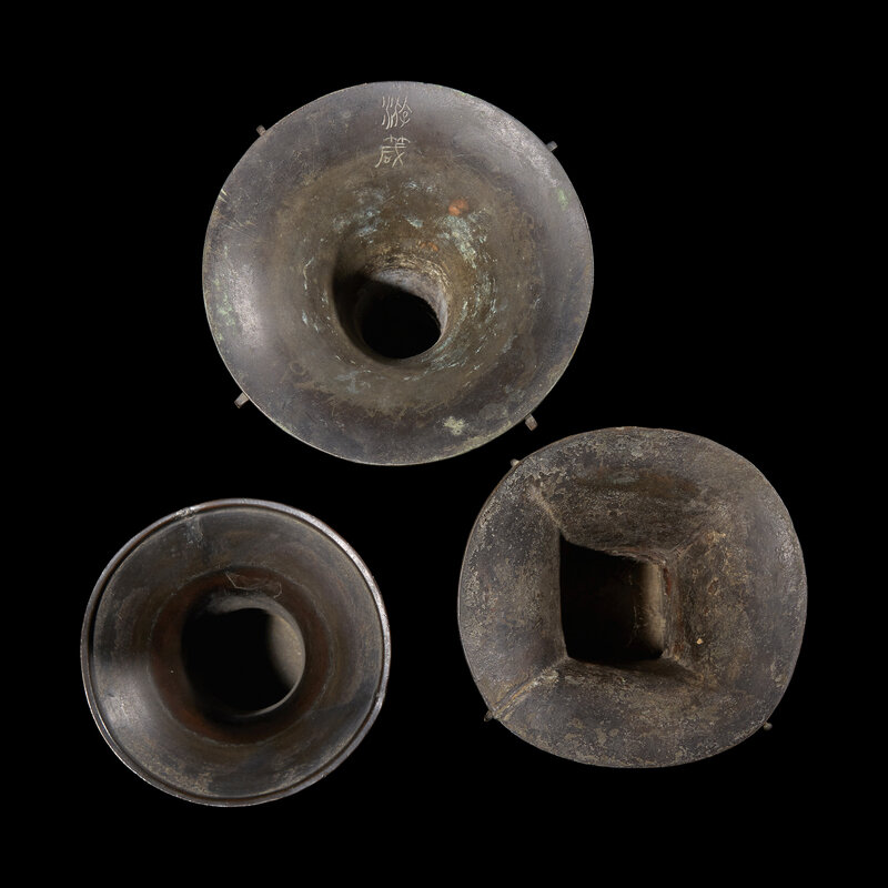 Of various patterns, with circular lip, tallest with two archaic characters within the lip (Youzhen?); all with mottled dark brown patina.