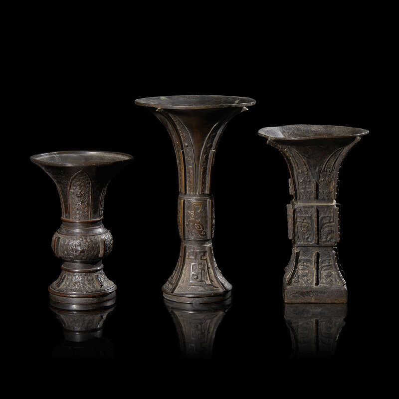 Three Chinese Archaistic Patinated Bronze Vases, Gu, Late Ming to Qing Dynasty