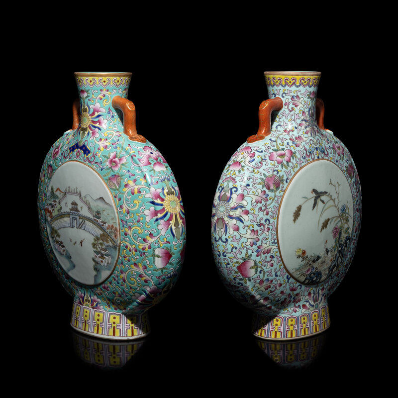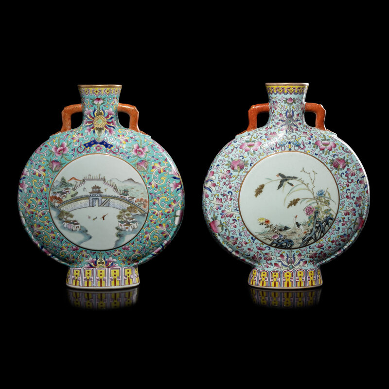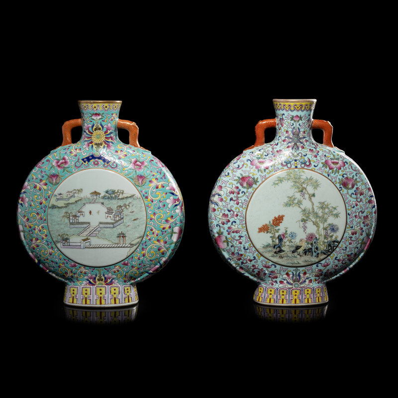 An Associate Pair of Chinese Famille Rose Porcelain Moon Flasks, 20th Century