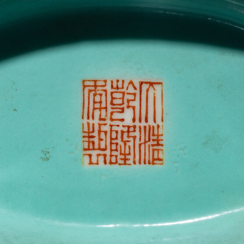 Each of flattened circular form supported on a high and slightly splayed foot below a cylindrical neck, set to either side with gilt coral red handle, the center enameled with a landscape, scene of birds and flowers.