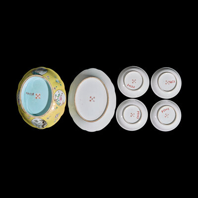 Comprising two pairs of dishes, one floriform plate and one large floriform bowl, all with "Yi Yuan Tang Xuan Zhi" mark to the underside.