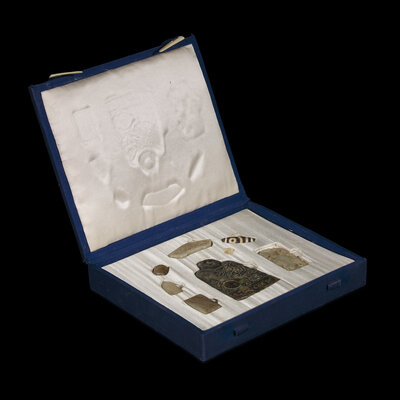 The group consists of a beige jade axe pendant, a rectangular jade pendant, a miniature jade ornament, a jade tortoise shell, a small jade sword guard, a miniature jade vase, and a Tibetan dzi bead, all in a fitted case.