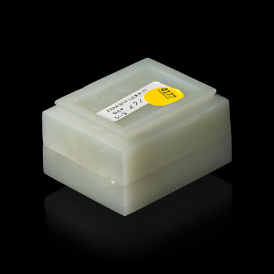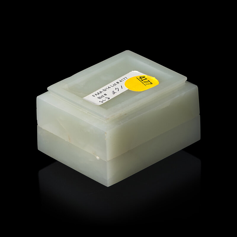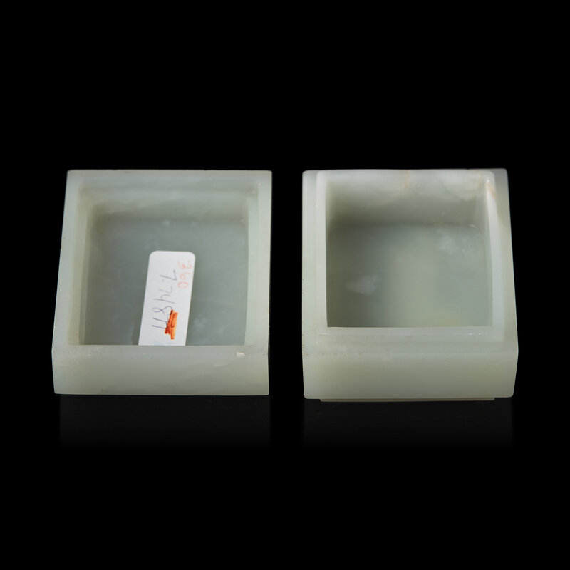 The rectangular box with beveled cover, carved in low relief with archaistic scrolls and lappet border, all raised on an inset foot, the stone of slightly greyish tone with faint russet inclusions.
