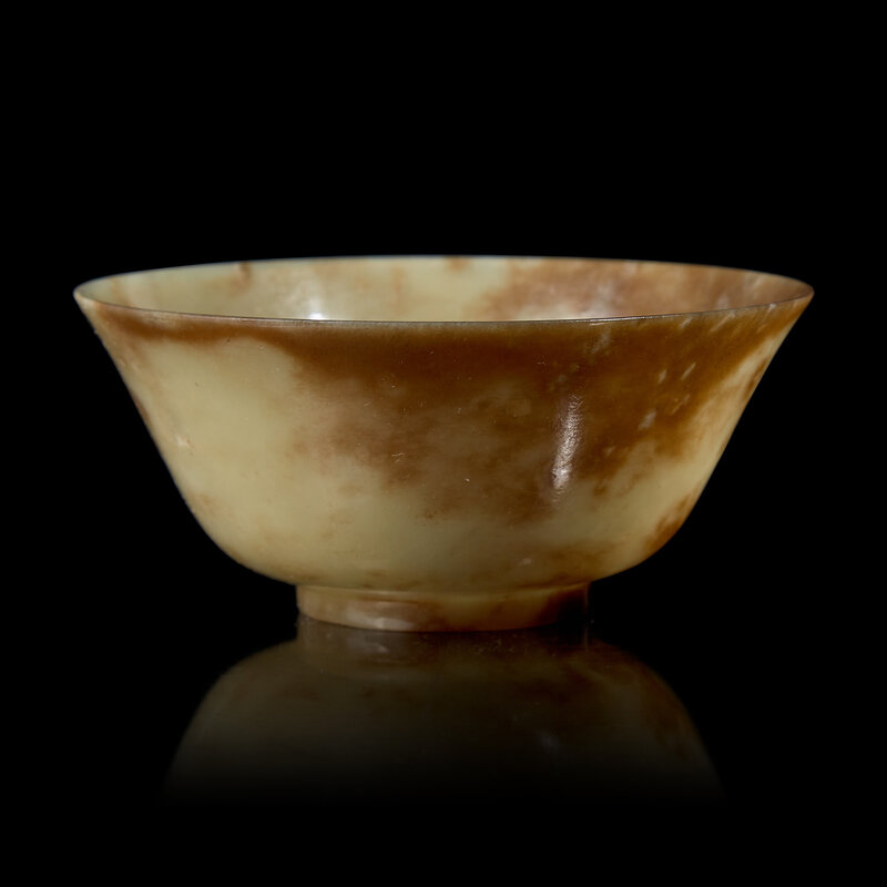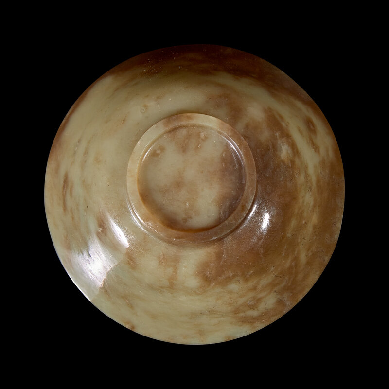 The yellow-beige jade bowl with russet brown inclusions, high polish.