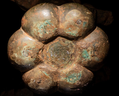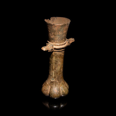 The hollow cylindrical body ending in a paw-shaped foot, the mid-section decorated with a raised ring and flanked by a pair of beast head-form handles.