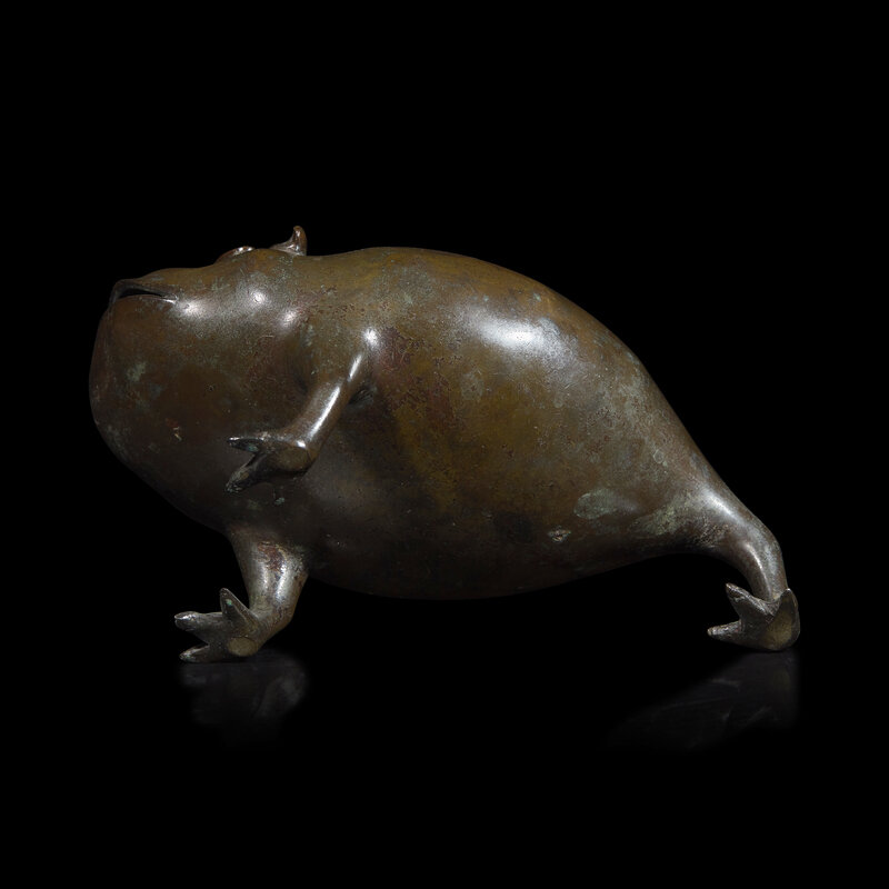 The mythical figure seated on his three-legged toad's back, a string of coins around his neck, dark brown patina.