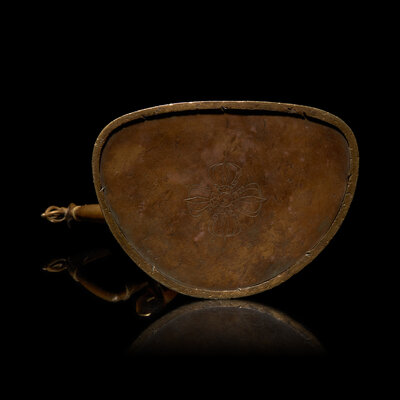 Seated in padmasana, with a sword raised in one hand, on a double lotus base, base plate engraved with visvavajra.