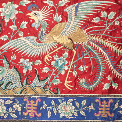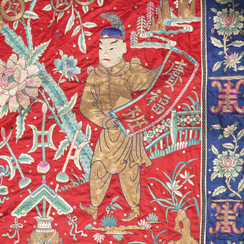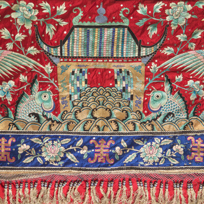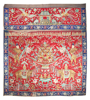 The center of the panel worked in multi-color threads depicting a busy garden scene centered with a large basket filled with gold ingots, flanked by a pair of caparisoned elephants, attendants bearing couplets and flowering plants, the top register decorated with a pavilion surrounded by winged phoenix and peony blossoms, all reserved on a bright red ground, bordered by shou characters alternating further flowering heads against a navy blue ground.