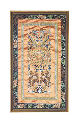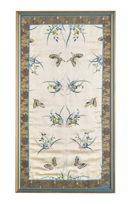 Width of butterflies (image) 30 3/4 in.; 78.2 cm. Hight 16 1/4in., 41.3cm. Width of dragon panel(image)28 1/2in., 72.5cm Height 16in., 40.6cm Width of the peacock 28in., 71.1cm Height 15 1/2 in., 39.3cm.