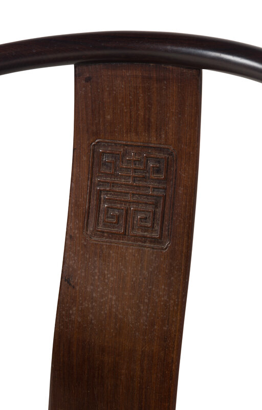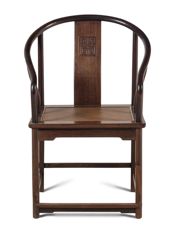 Of a dense fine-grained dark hardwood, possibly hongmu, the serpentine back with a Shou symbol carved in low relief, over a rectangular hard cane seat, circular legs, box stretcher