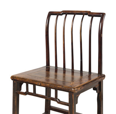 With stepped yoke, curved spindle back, over a rectangular paneled seat, box stretcher.