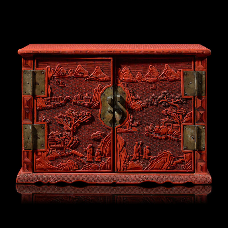A Chinese Carved Cinnabar Lacquer Two-Door Small Cabinet, Late 19th/20th Century