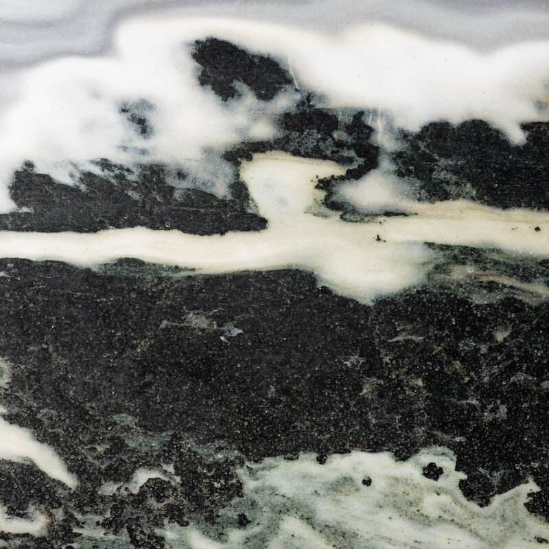 The black and grey-veined white marble panel boldly depicts an imaginary landscape of cloud-covered mountains, set within a hardwood table screen.