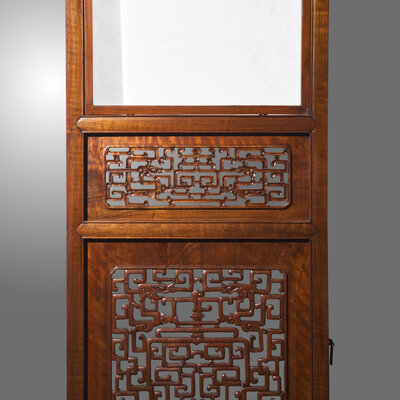 Each rectangular section comprising of intricately carved and pierced panels of archaistic kuei dragon scrollwork, later inset beveled glass plates.