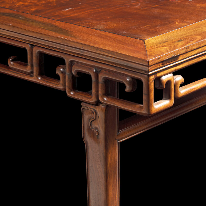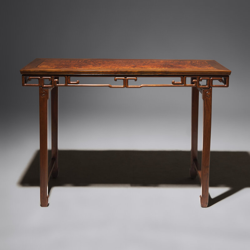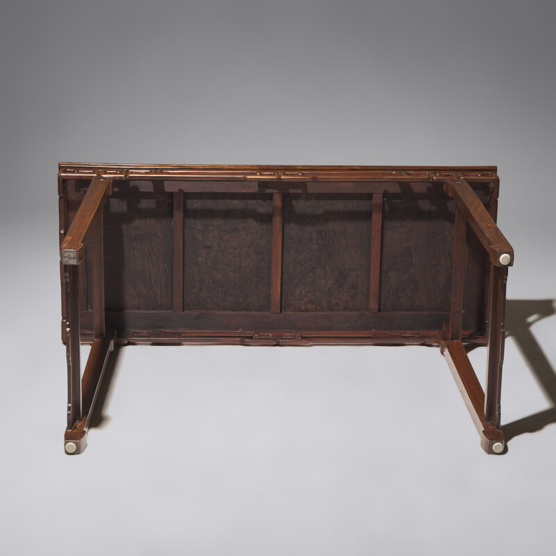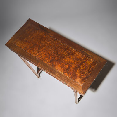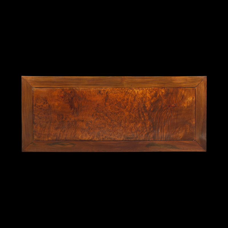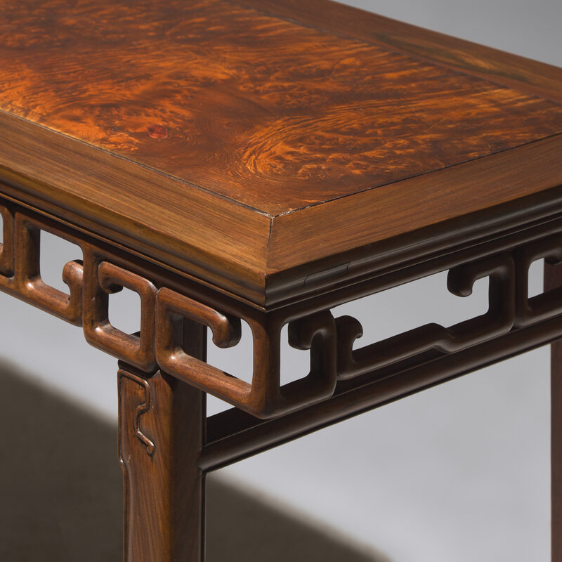 The rectangular top inset with a highly-figured burlwood panel, over a stylized scrollwork apron and rectangular legs terminating in "hoof" feet, side spandrels above the feet carved with low relief scrolls