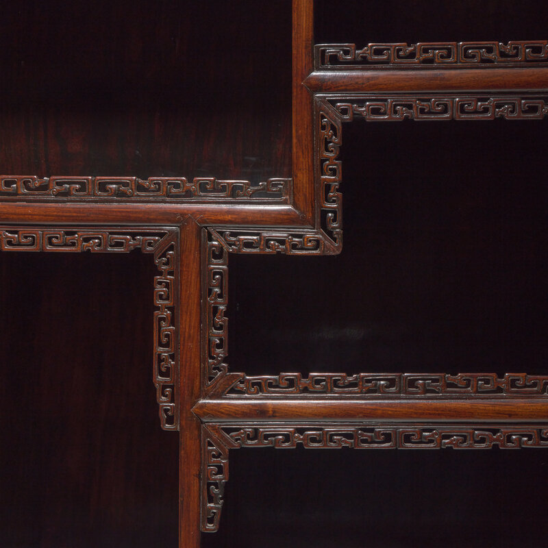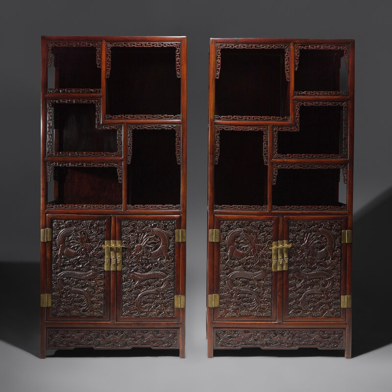 Each cabinet with five tiered display shelves with openwork geometric molding and double doors below carved with dragons among celestial clouds, with carved aprons showing fu bats and clouds.