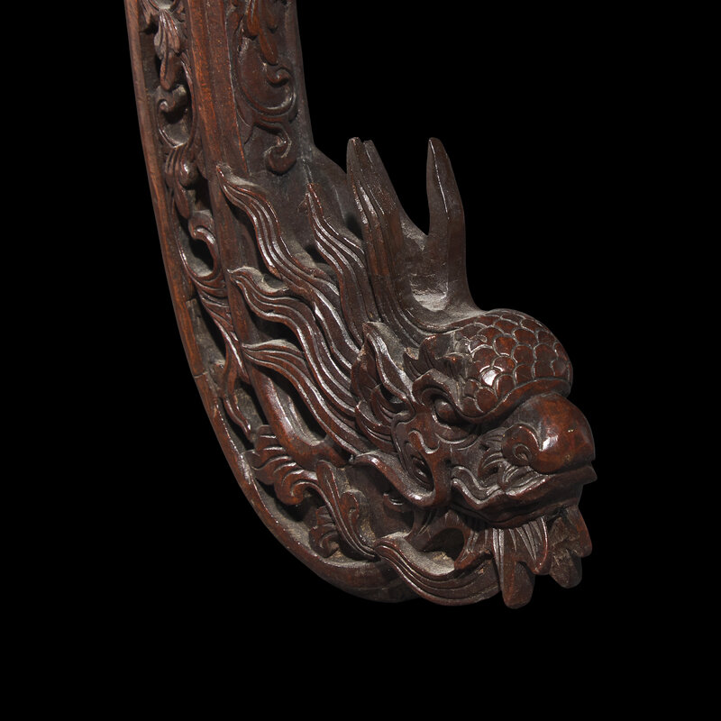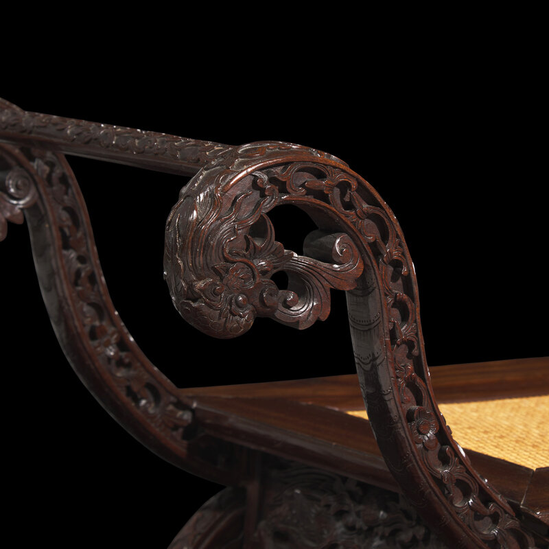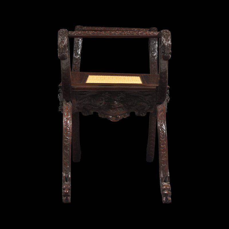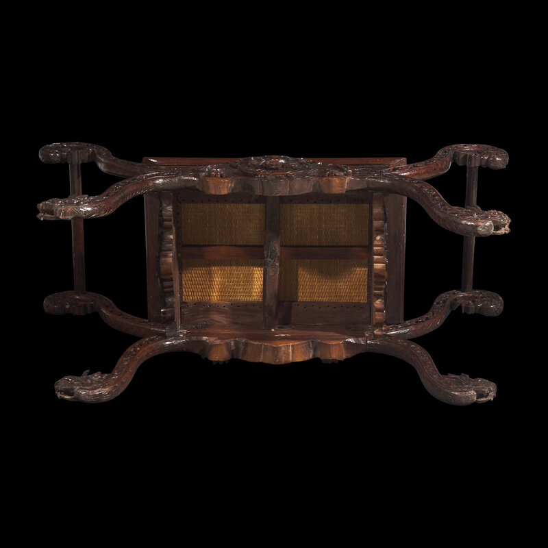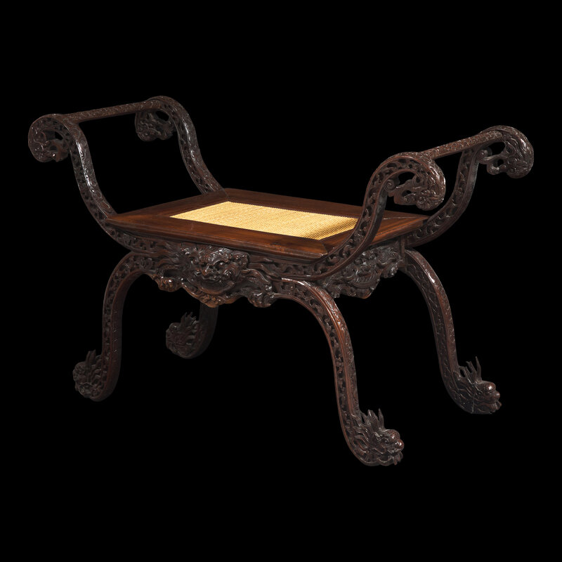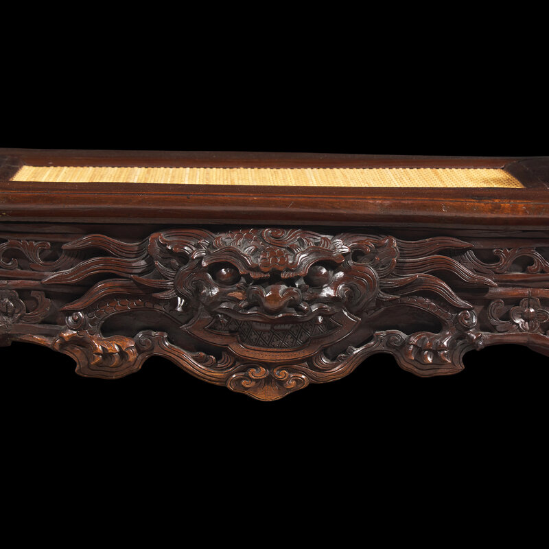With scrolled sides terminating in dragon's heads, with rectangular woven fiber seat, raised on scrolled legs terminating in dragon heads, floral scrolls to the sides.