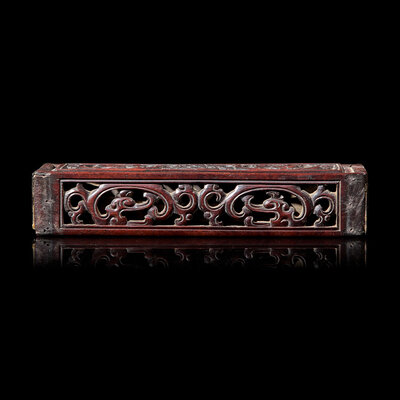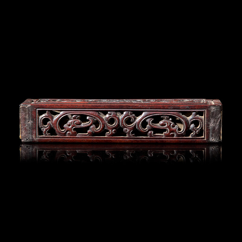 The rectangular box with sliding cover, overall decorated with reticulated scrolled kuei-dragons, metal liner with two receptacles for joss sticks.