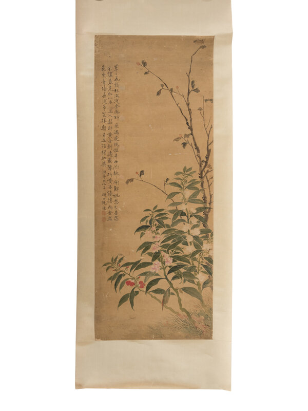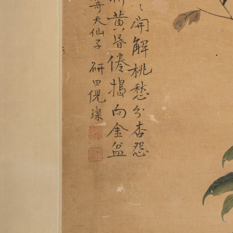 款識:茸茸花顫秋深淺。金鳳斜飛滿庭院。搖弄西風故故 開,解桃愁,分杏怨。不讓春光紅一片。玉人鬆卻黃金釧。遶叢攀折黃昏倦。搗向金盆色更奇,傍夜深,爭笑捲,朝看玉指猩紅染。調寄天仙子,研田倪璨。