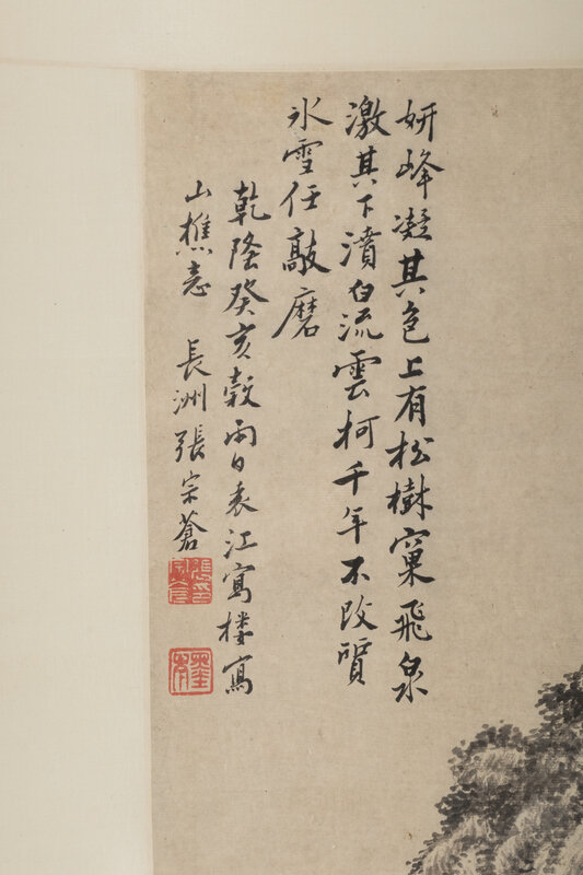 款識:妍峰凝其色,上有松樹窠。飛泉激其下,清白流云柯。千年不改質,冰雪任敲磨。乾隆癸亥(1743)榖雨日,袁江寫樓寫山樵意。長洲張宗蒼。
