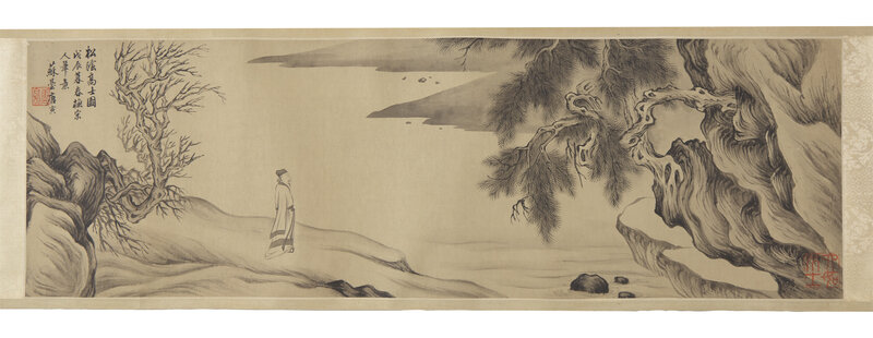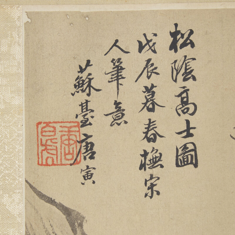 款識:松蔭高士圖。戊辰(1508)暮春撫宋人筆意,蘇臺唐寅。