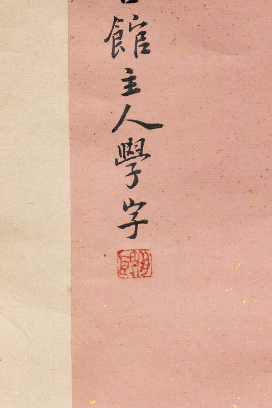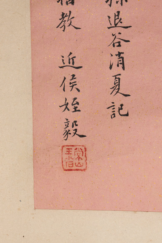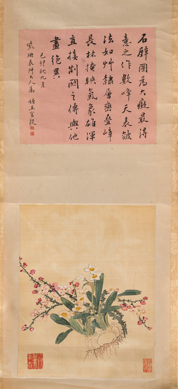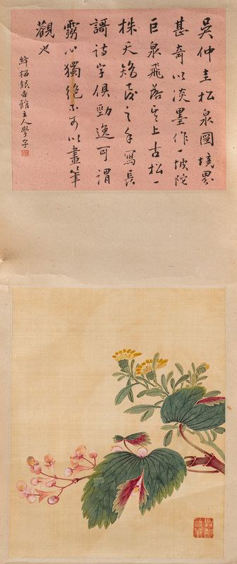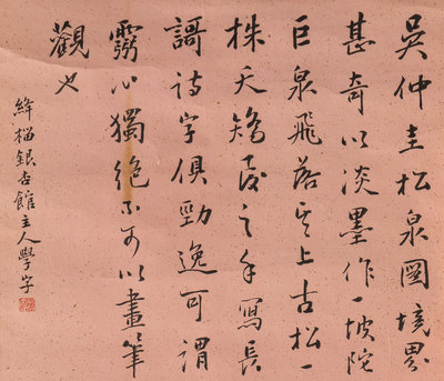 題跋:吳仲圭松泉圖境界甚奇。以淡墨作一坡陀巨泉飛落其上。古松一株天矯凌之,手寫長歌,詩字俱勁逸,可謂靈心獨絕,不可以畫筆觀也。絳榴銀杏舘主人學字。
