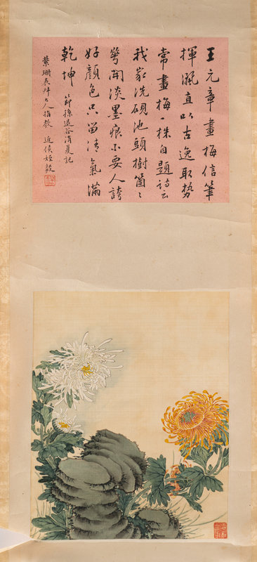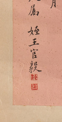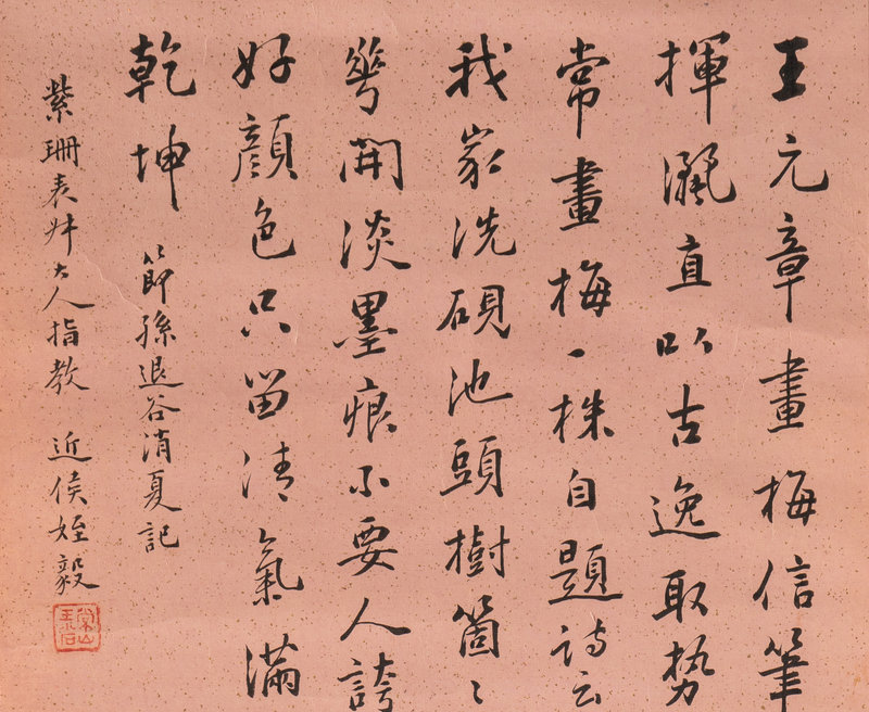 題跋:王元章畫梅信筆揮灑,直以古逸取勢,常畫梅一株,自題詩云:我家洗硯池頭樹,個個萼開淡墨痕,不要人誇好顏色只留清氣滿乾坤。節孫退谷消夏記。紫珊表叔大人指教。近侯侄毅。
