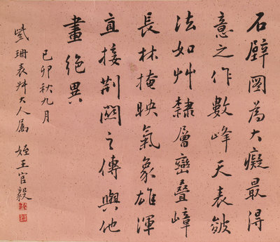 題跋:石辟圖爲大癡最得意之作。數峰天表,皴法如草隸,層巒叠嶂,長林掩映,氣象雄渾,直接荊関之傳,與他畫絕異。己卯(1855)秋九月紫珊表叔大人屬,侄王官毅。