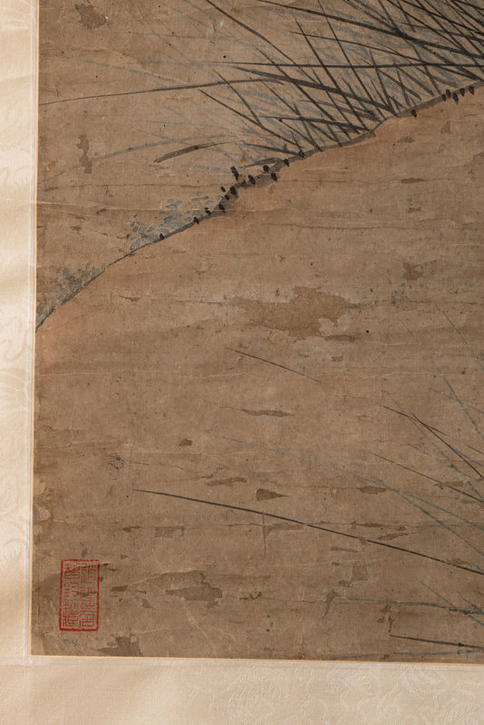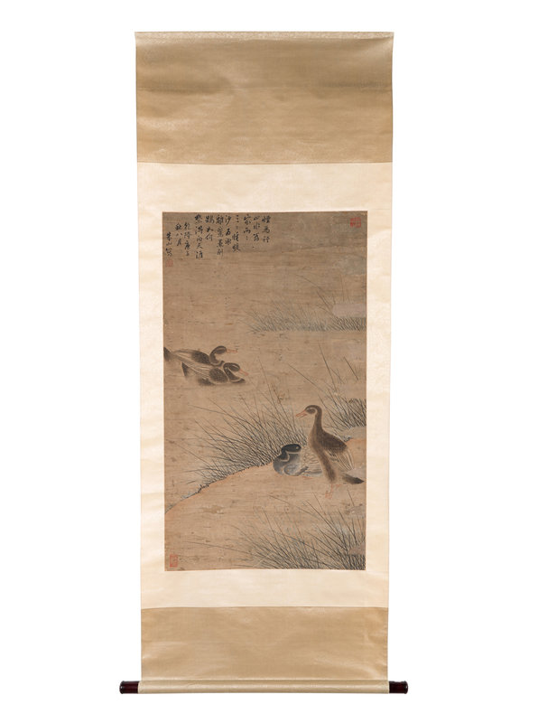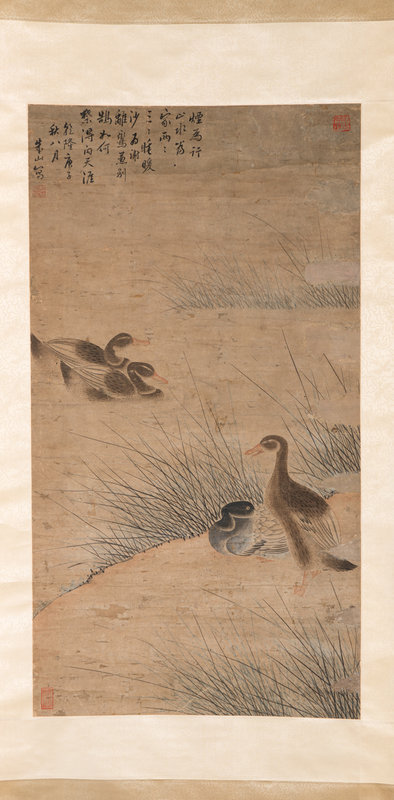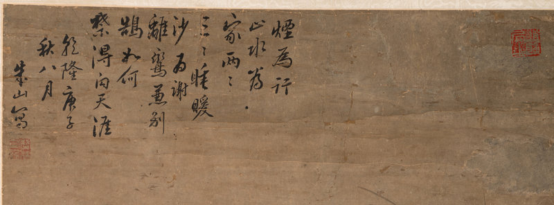 款識:煙為行止水為家,兩兩三三睡暖沙。為謝離鸞兼別鵠,如何禁得向天涯。乾隆庚子(1780)秋八月,朱山寫。