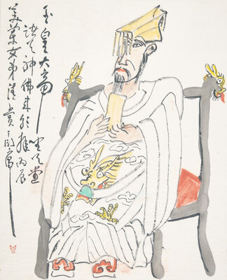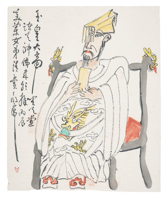 -Seated Dignitary, Inscribed, dated to a Bingchen year, equivalent to 1976, dedicated to Meilan Nvdi, and signed, with one seal of the artist, height 33 in., 83.7 cm; width 27 1/2 in., 69.8 cm.