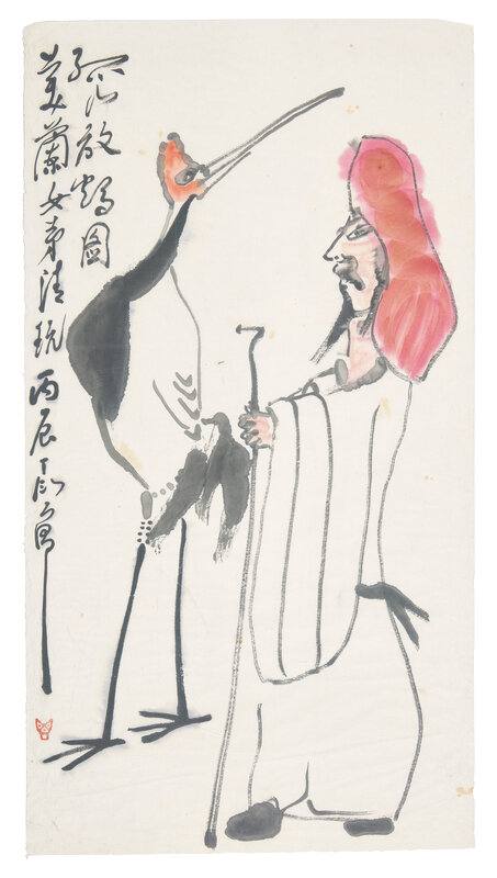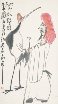 -Sage with Crane, Inscribed, dated to a Bingchen year, equivalent to 1976, dedicated to Meilan Nvdi, and signed, with one seal of the artist, height 34 1/2 in., 87.5 cm, width 19 in., 48.2 cm.