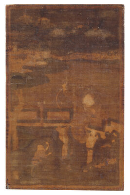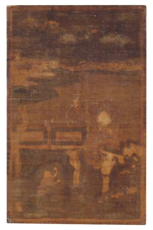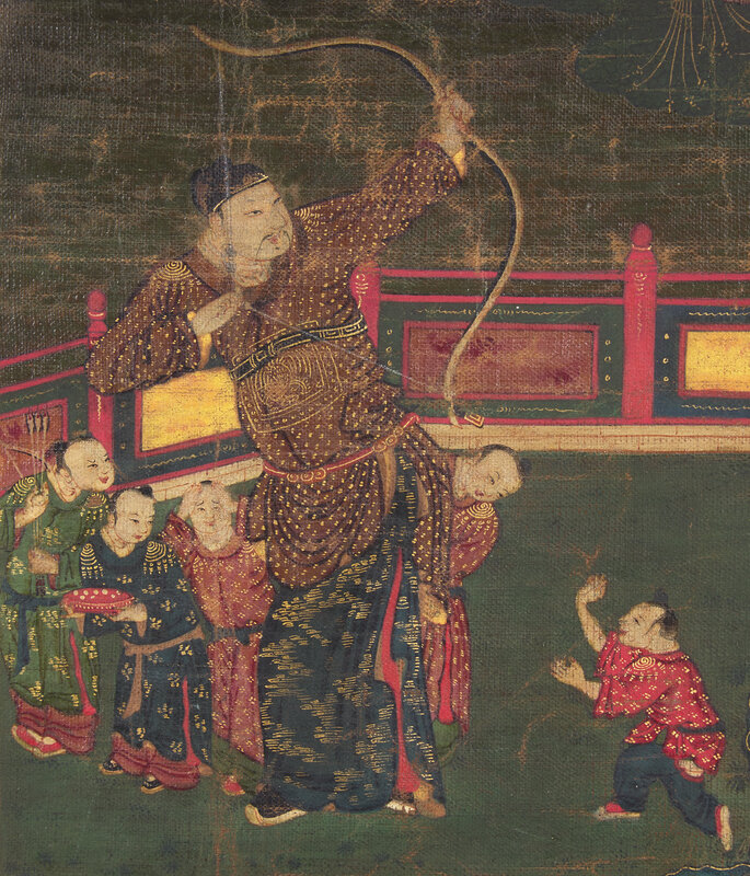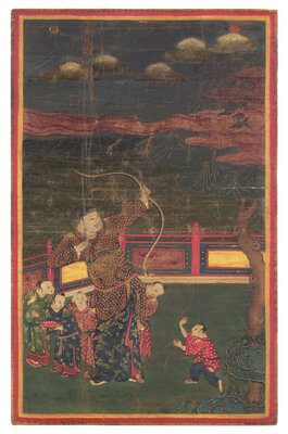 The present work depicts the hero Zhang Xian protecting young boys from the threat of the eclipse-causing Heavenly Dog. This subject was popular in China, with talismanic power to secure health and good fortune for children, particularly boys. The present work is unusual, as it incorporates stylistic traits and techniques more typically associated with Tibetan thangka, suggesting a commission from a Tibetan or Tibetan-train artist.